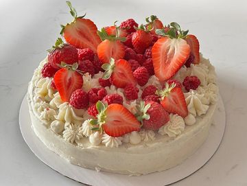 Cocolate or vanilla, there is no wrong choice. This 8" cake, in the flavour of your selection, is toped with decoratively-piped, silky-smooth vanilla butter cream and fresh berries. Serves 6-8.